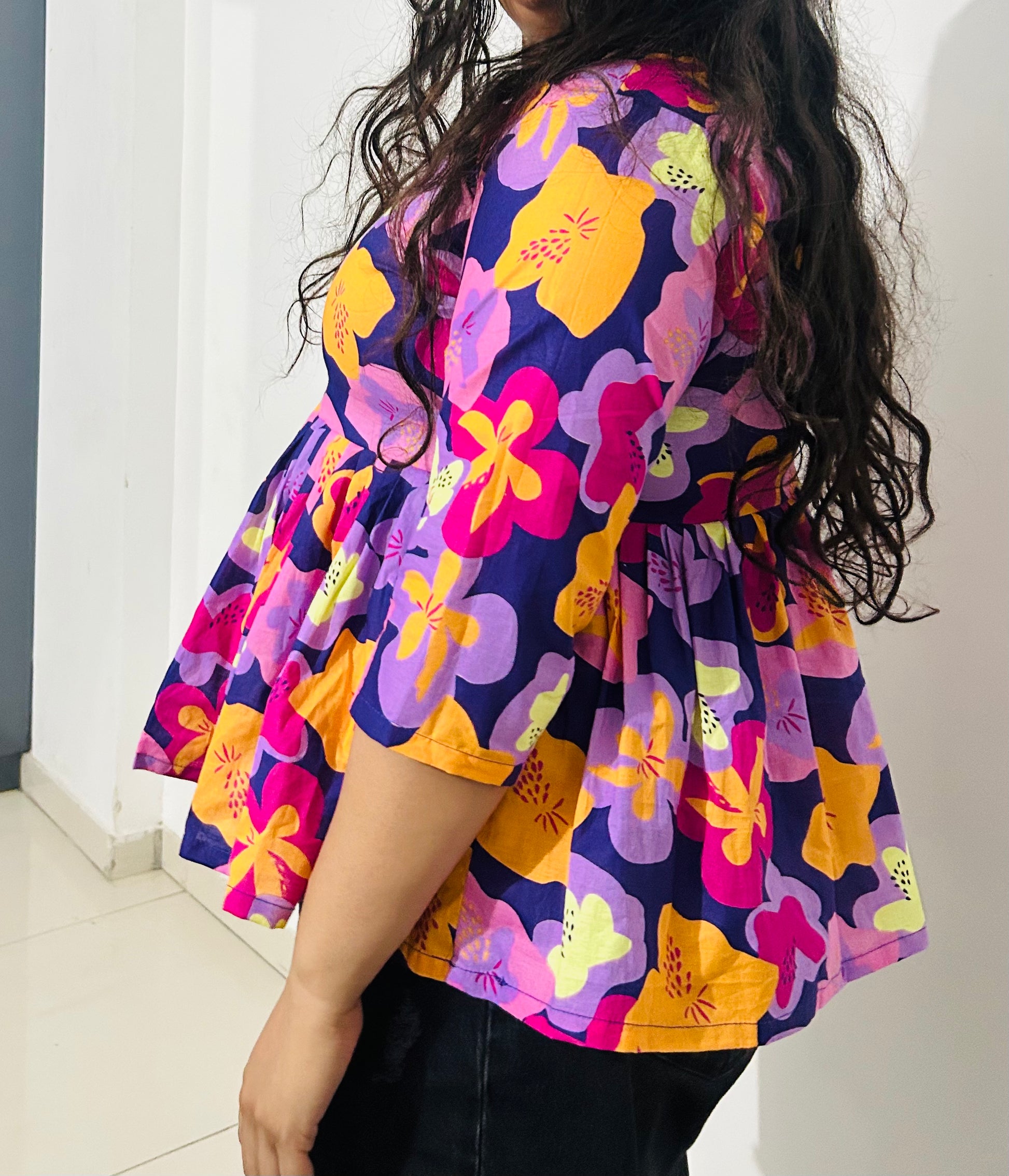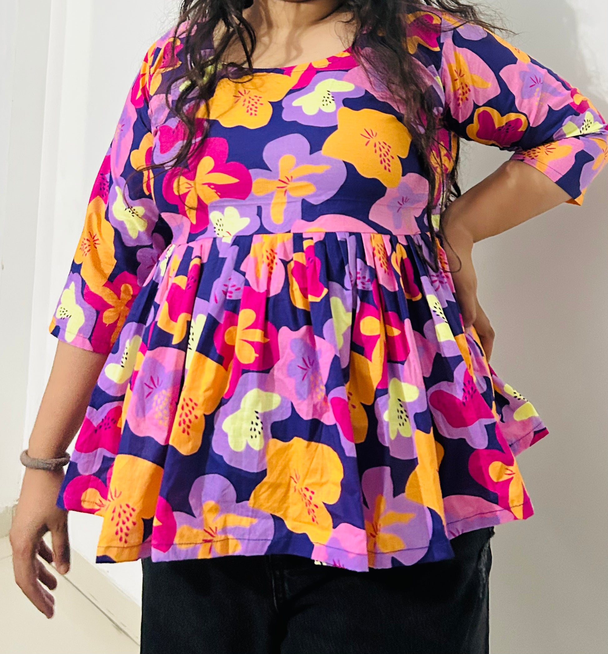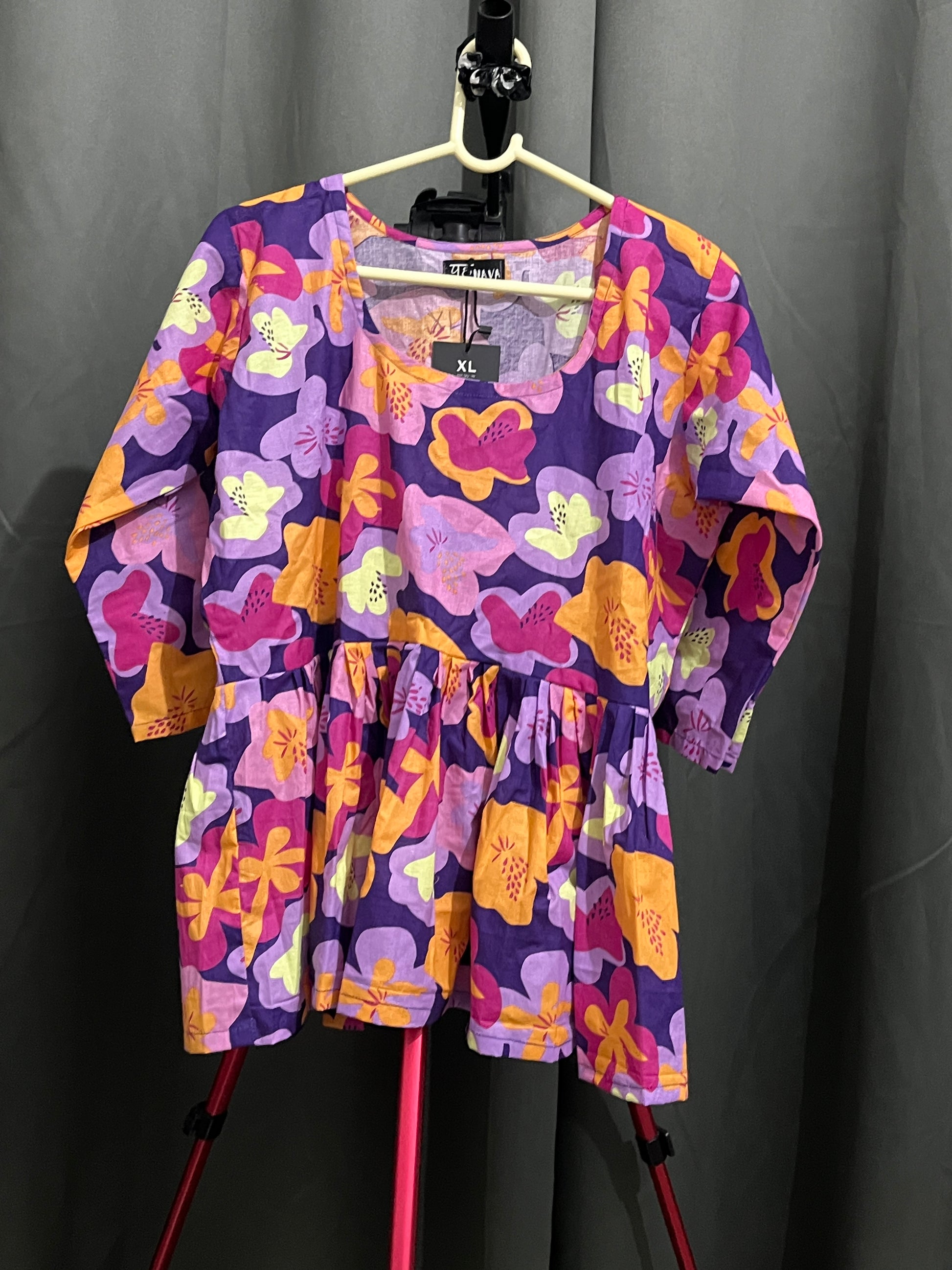 Fabric: 100% Cotton Color: Purple base with multicolor floral print (yellow, pink, orange, lilac, lime green) Sleeves: 3/4th Sleeves Neckline: Round neck Length: Short / Hip-length Fit: Relaxed Flared Fit