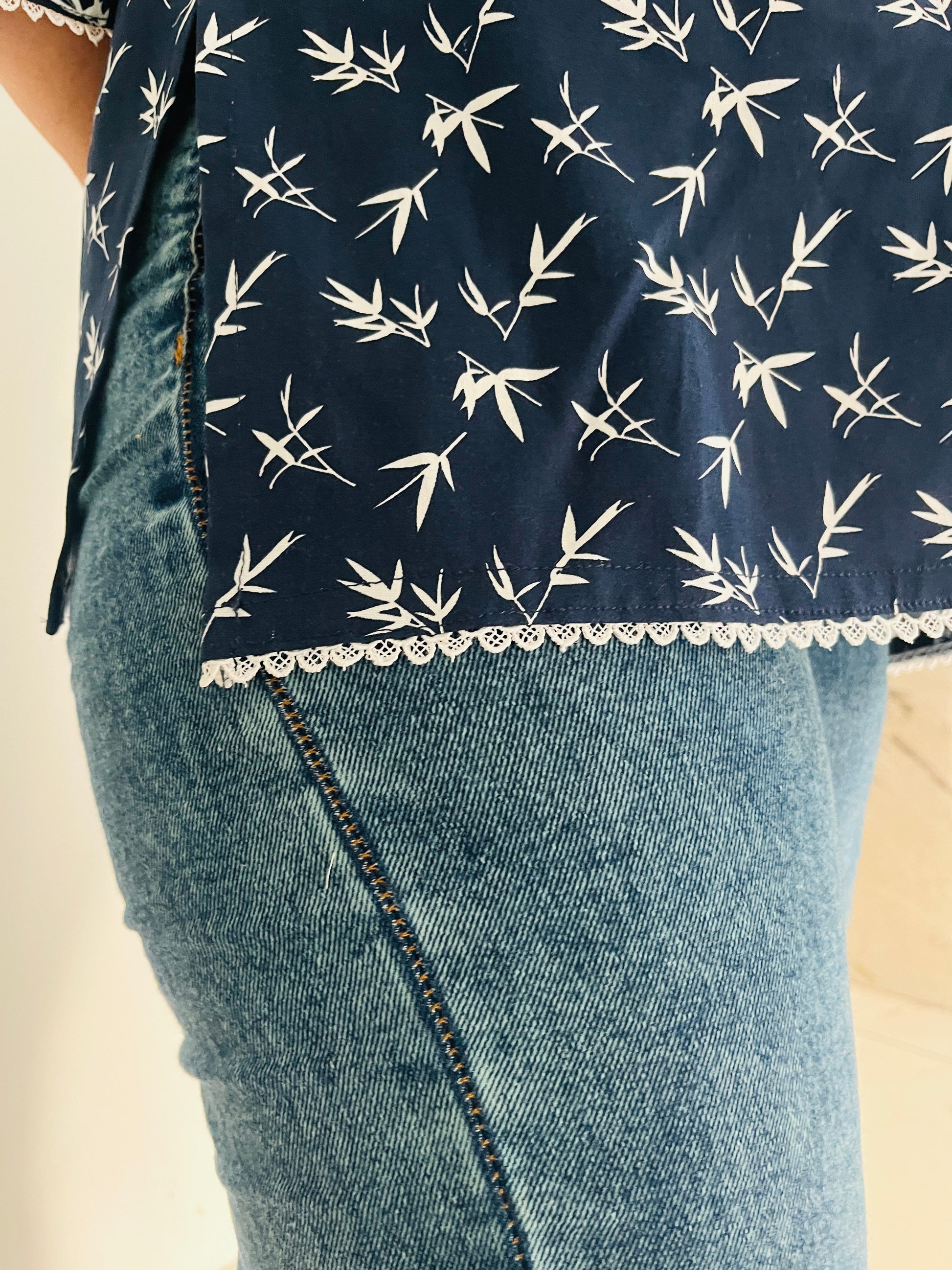 Step into effortless style with our Navy Breeze Cotton Kurti, a perfect blend of comfort and charm. Crafted from soft, breathable cotton, this kurti features a graceful all-over white bamboo leaf print against a rich navy base. Designed in a straight fit with elegant side slits and gathered 3/4th sleeves, it’s detailed with delicate lace trim that adds a refined finish. Ideal for casual days or relaxed workwear, this piece brings sophistication with a touch of nature.