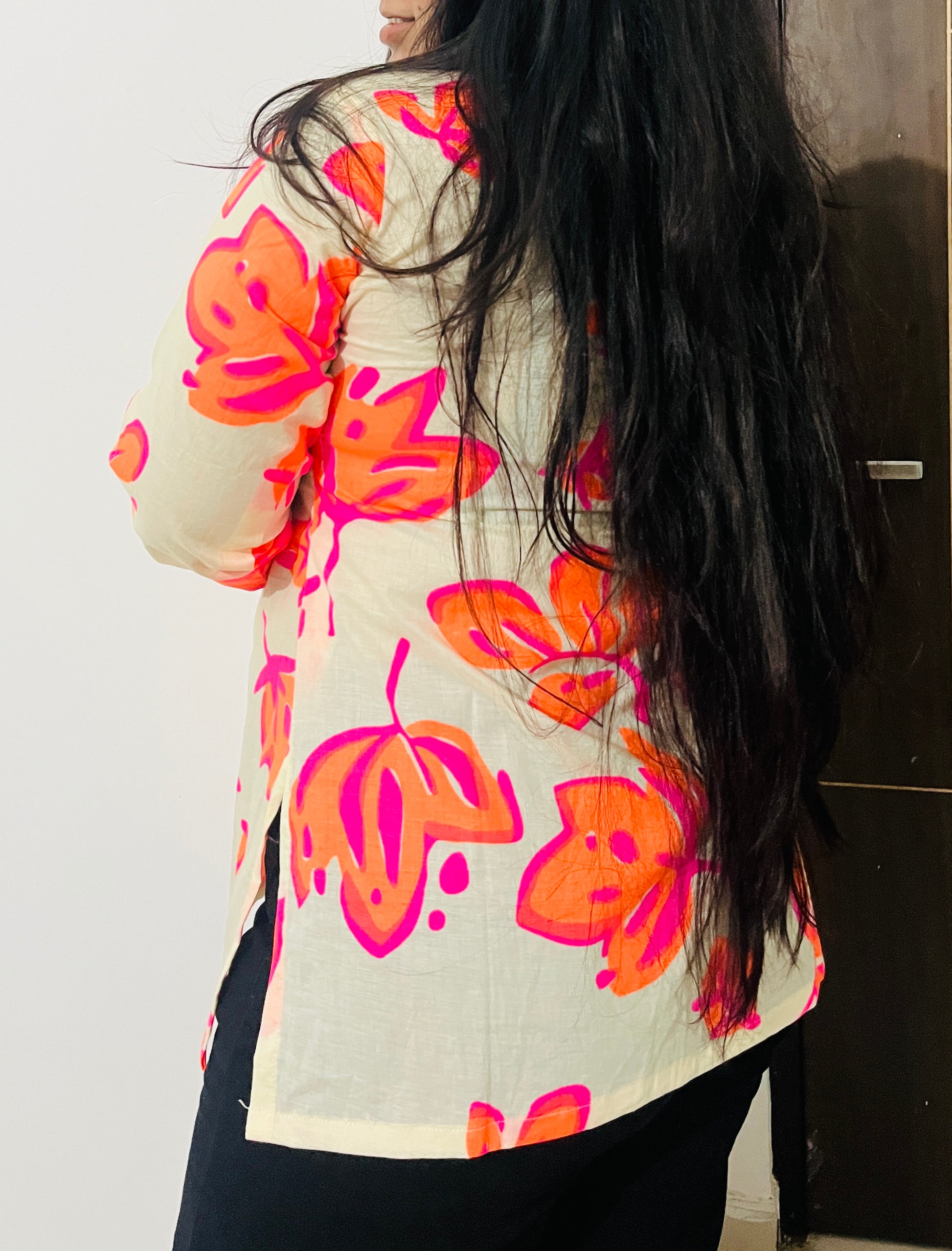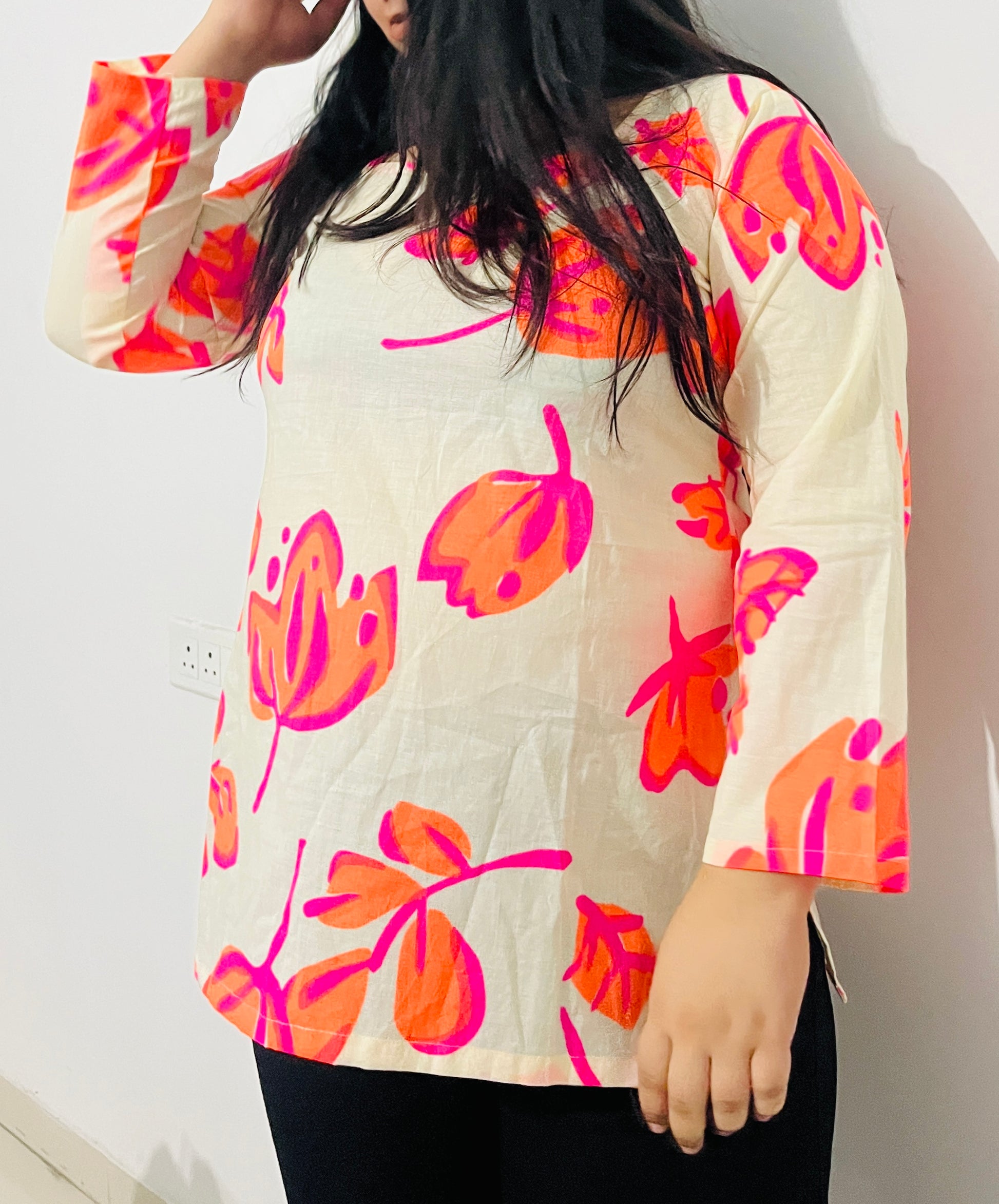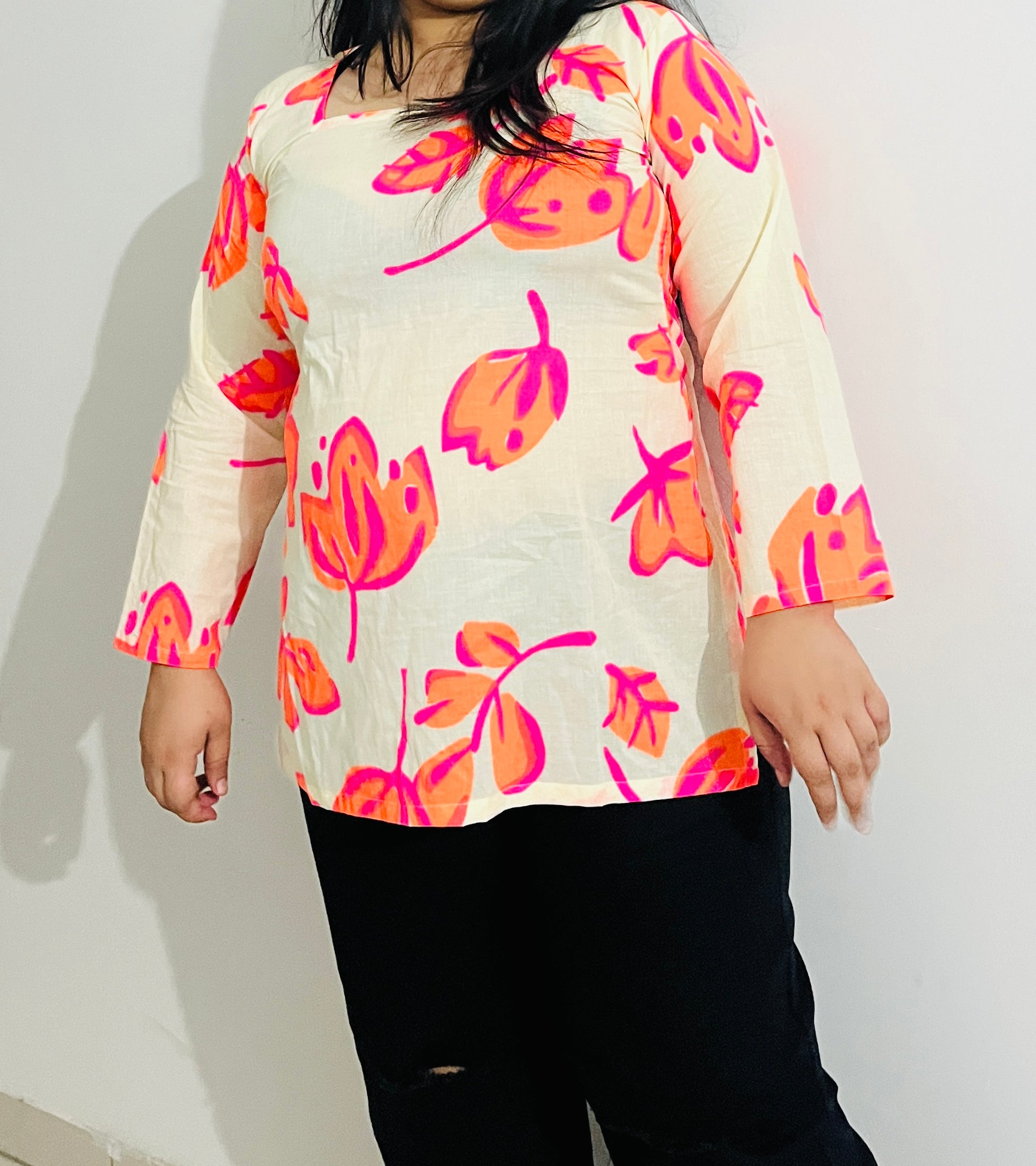 Brighten your wardrobe with the Sunset Petals Kurti, featuring soft cream cotton adorned with hand-drawn floral prints in cheerful shades of orange and pink. The relaxed silhouette, square neckline, and 3/4th sleeves make it ideal for warm days when comfort and style go hand in hand. A perfect pick for casual outings, travel, or lounging in style.